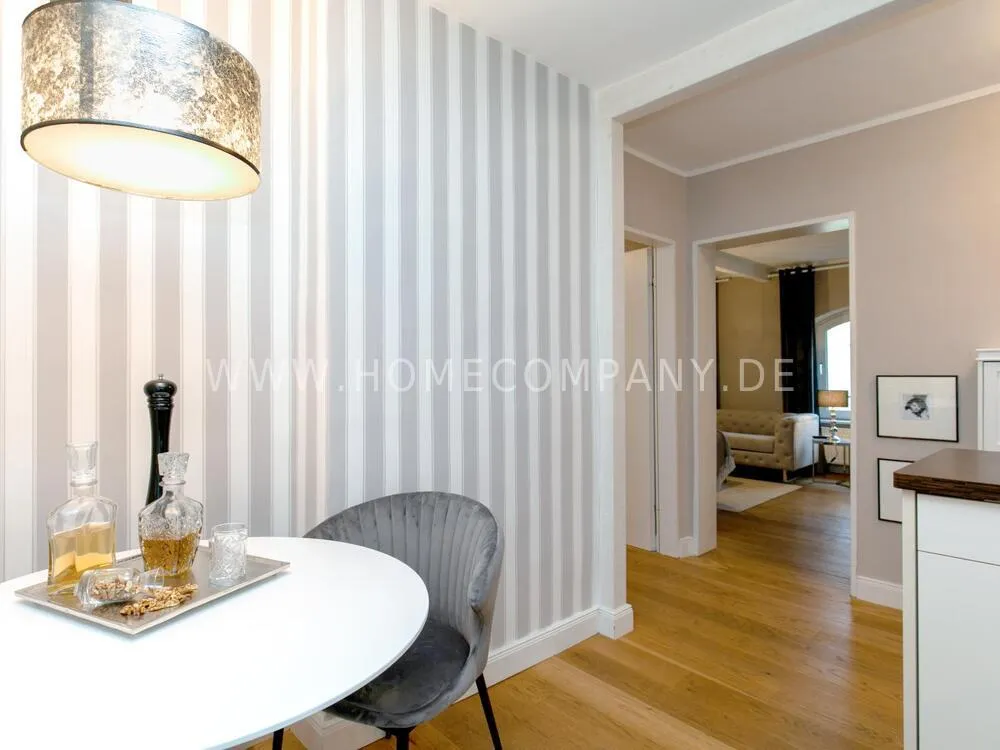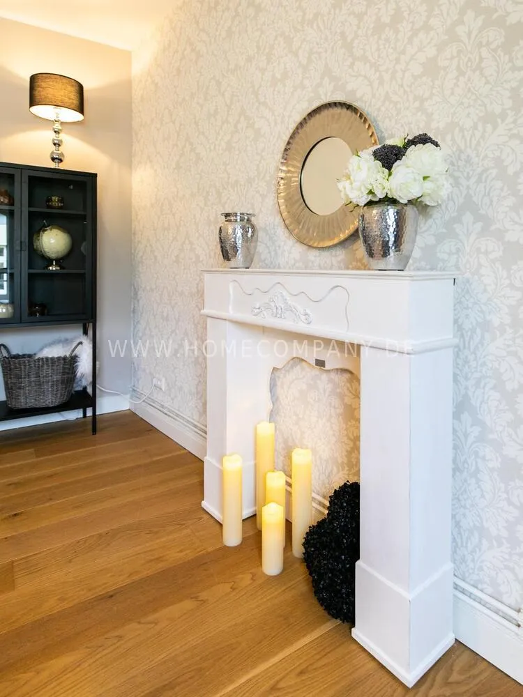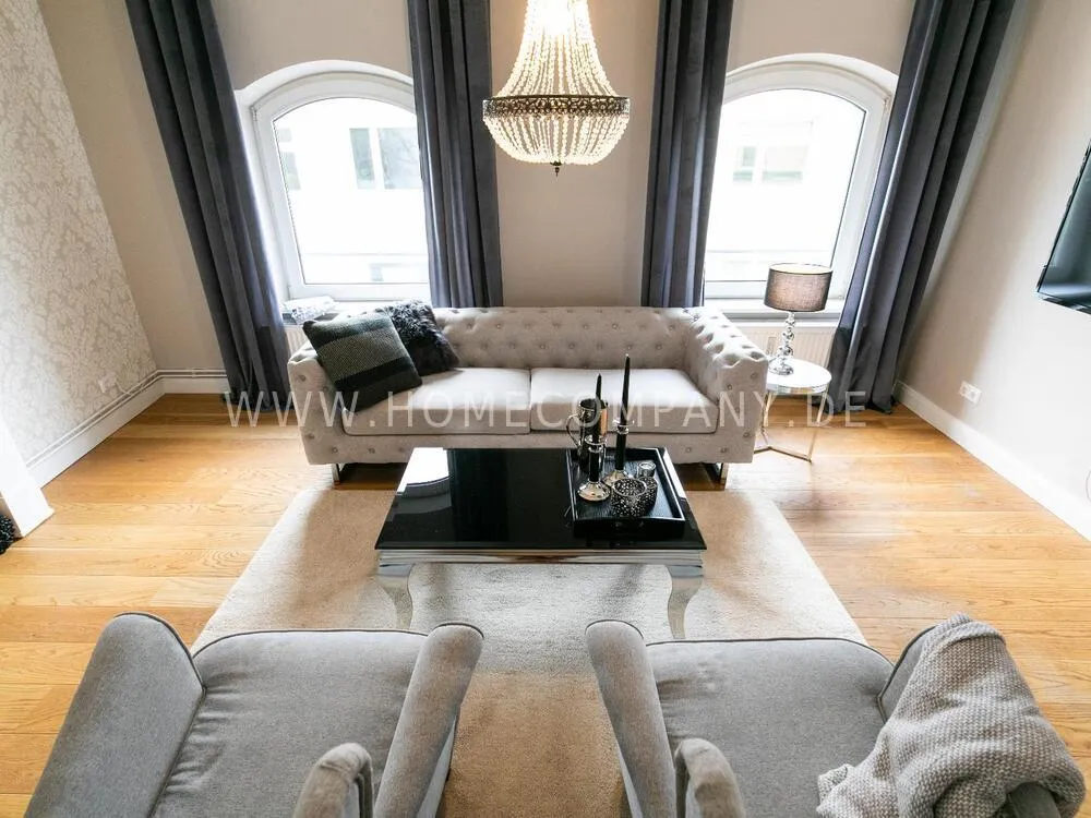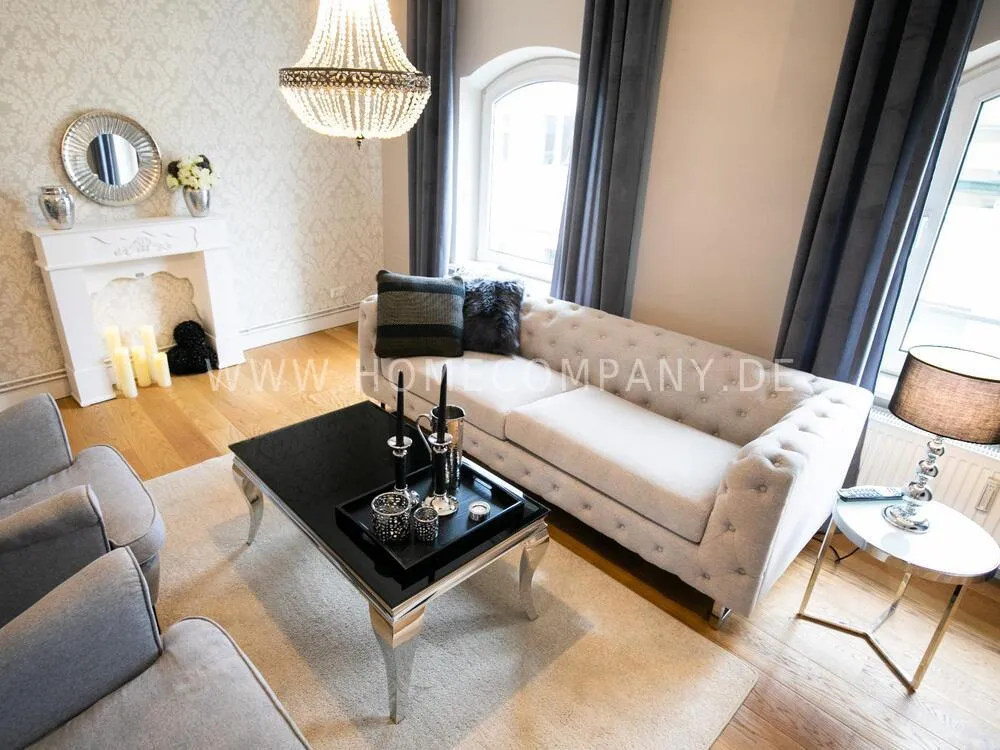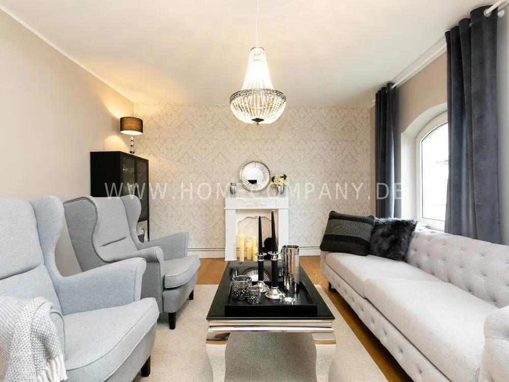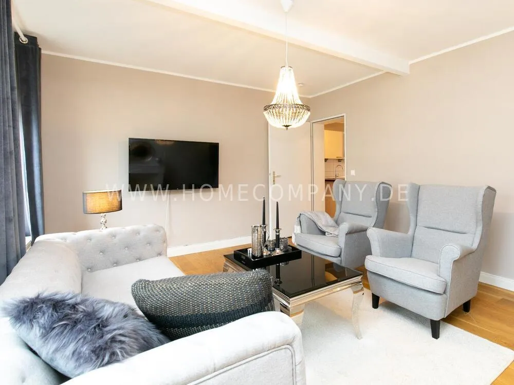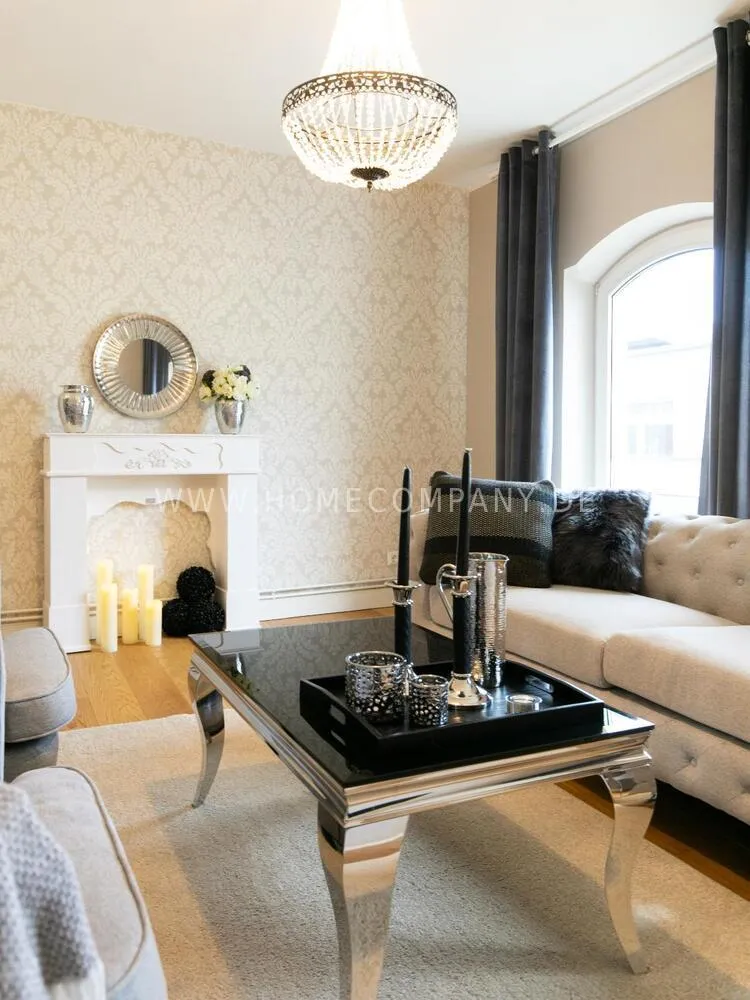 Fully renovated end of 2020 and new in apartment in Townhouse Chic. The harmonious color and furniture design in beige, gray, black give this business apartment a timeless ambience. The wallpaper with a modern baroque pattern, two cozy light gray modern wing chairs, a mantelpiece, the modern metal tall cupboard, a 48-inch look and the chandelier move the beige 3-seater sofa in Chesterfield style and the coffee table with black glass top and access accessories a glamorous look to the living room in scene and property.