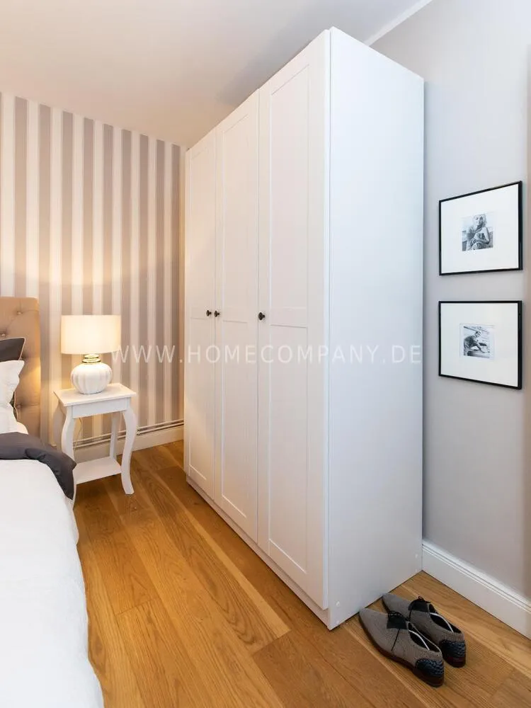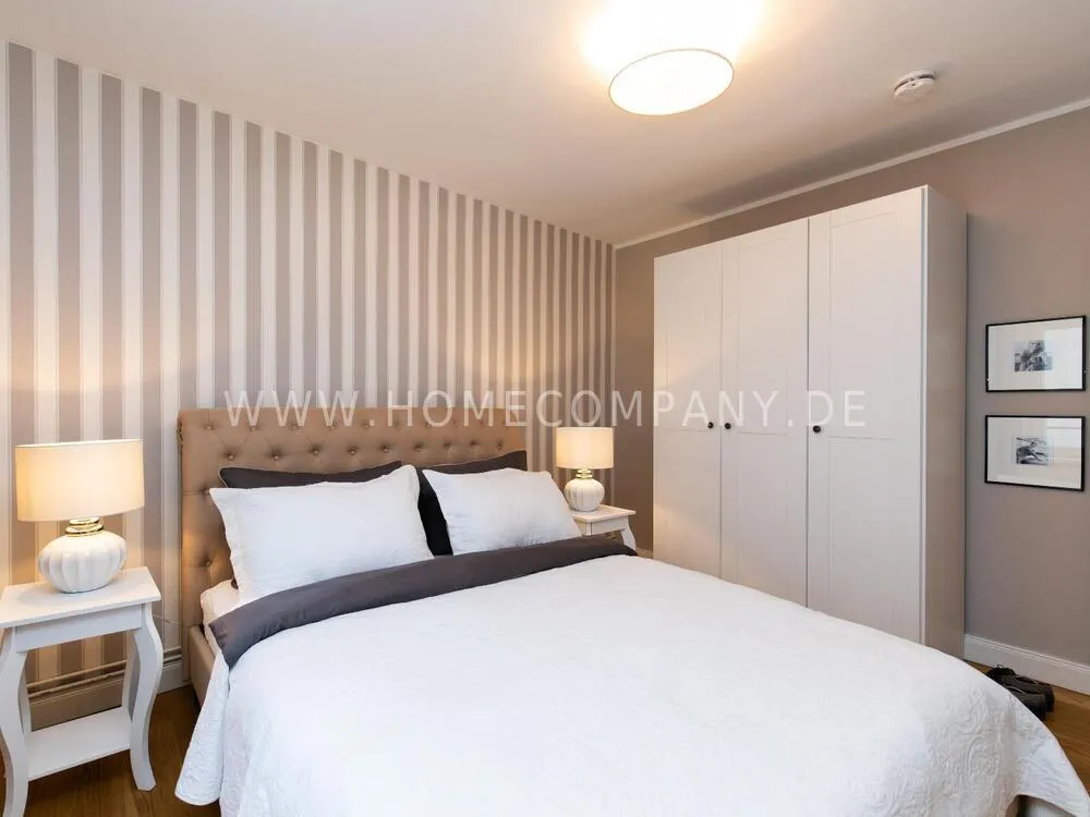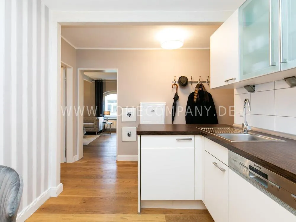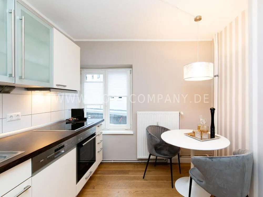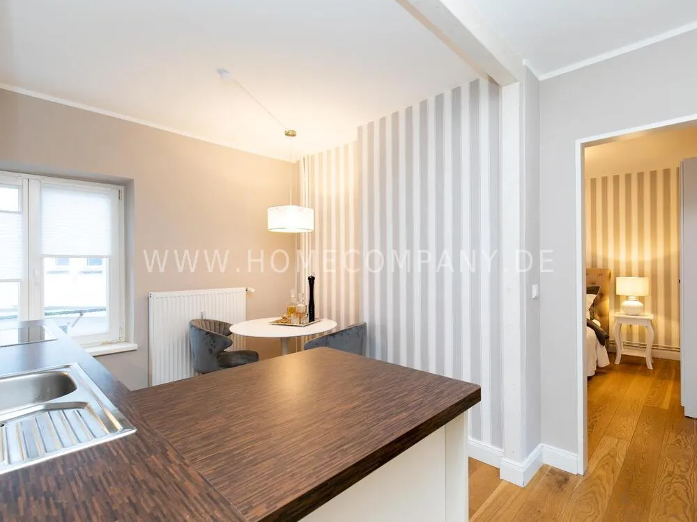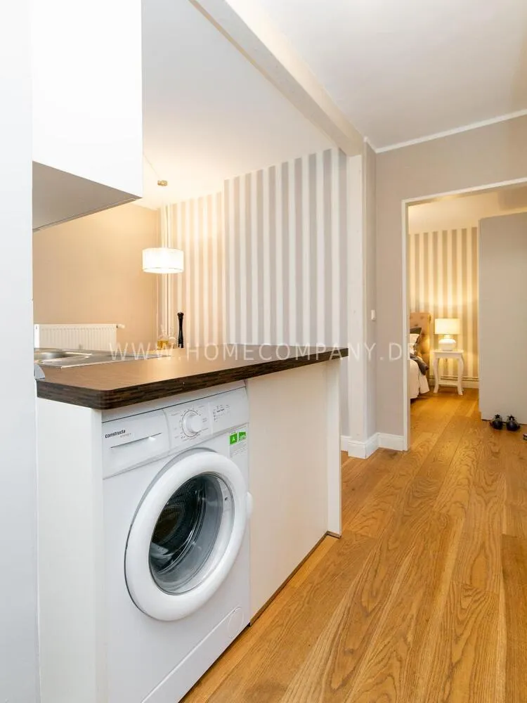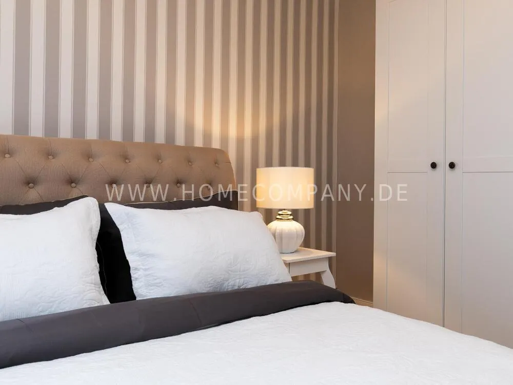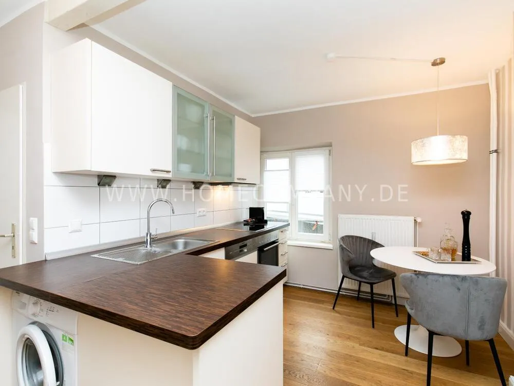 Fully renovated end of 2020 and new in apartment in Townhouse Chic. The harmonious color and furniture design in beige, gray, black give this business apartment a timeless ambience. The wallpaper with a modern baroque pattern, two cozy light gray modern wing chairs, a mantelpiece, the modern metal tall cupboard, a 48-inch look and the chandelier move the beige 3-seater sofa in Chesterfield style and the coffee table with black glass top and access accessories a glamorous look to the living room in scene and property.
