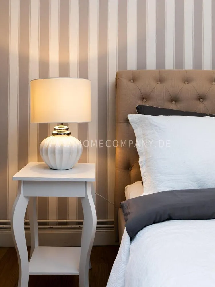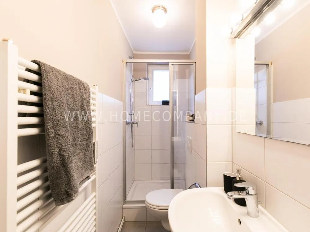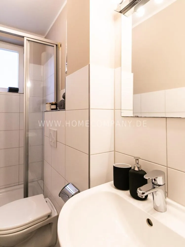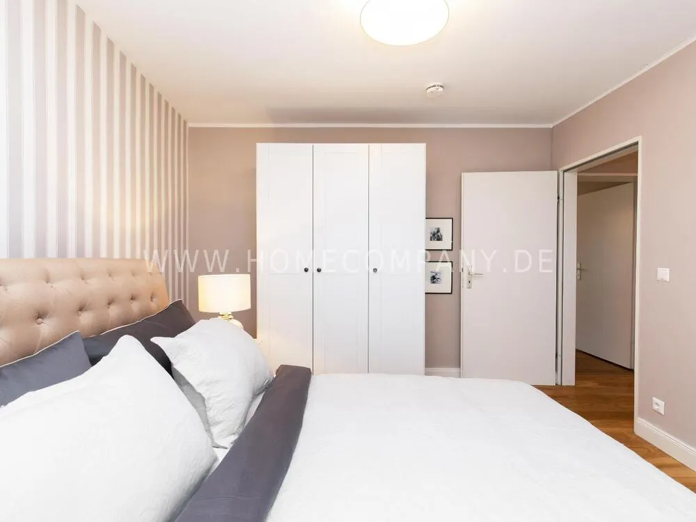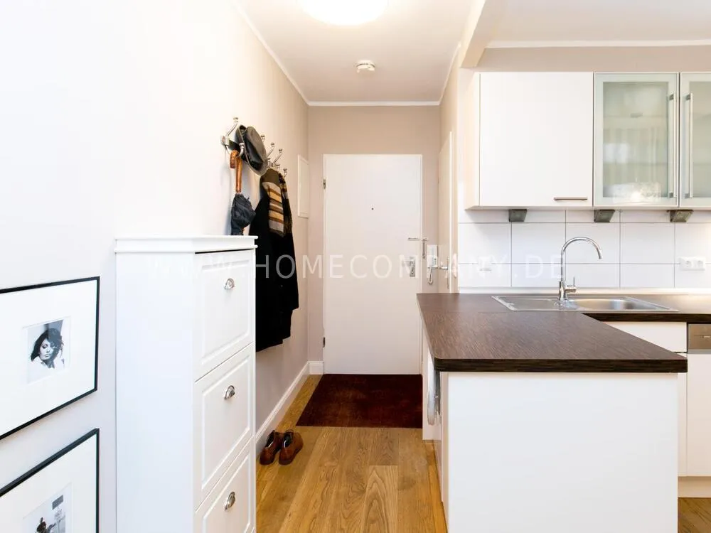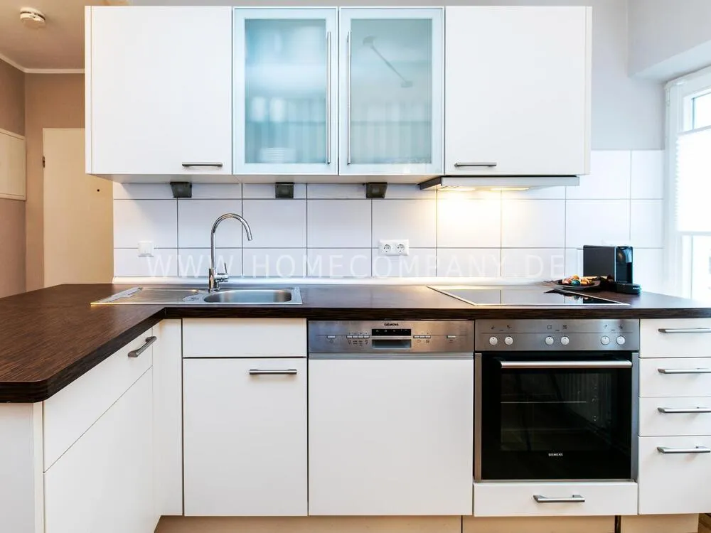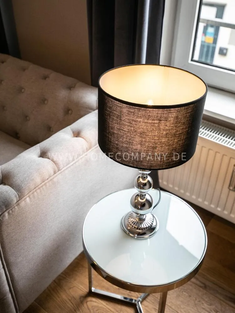 Fully renovated end of 2020 and new in apartment in Townhouse Chic. The harmonious color and furniture design in beige, gray, black give this business apartment a timeless ambience. The wallpaper with a modern baroque pattern, two cozy light gray modern wing chairs, a mantelpiece, the modern metal tall cupboard, a 48-inch look and the chandelier move the beige 3-seater sofa in Chesterfield style and the coffee table with black glass top and access accessories a glamorous look to the living room in scene and property.