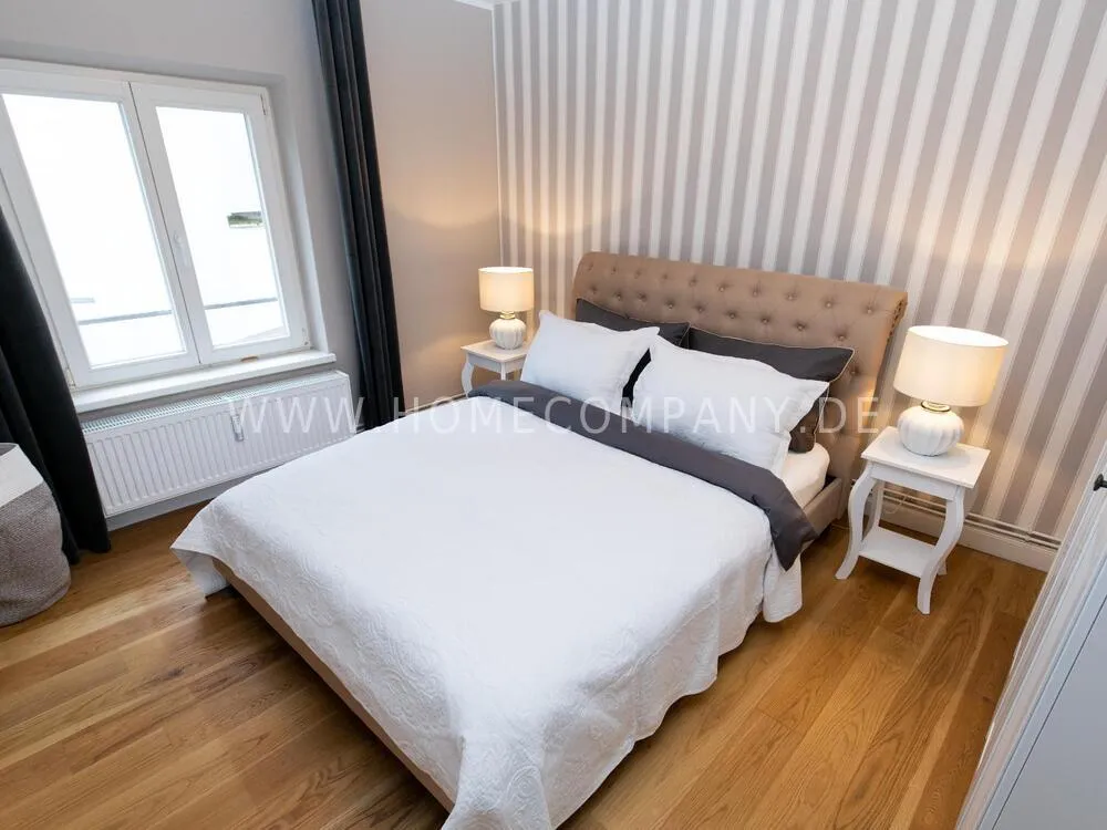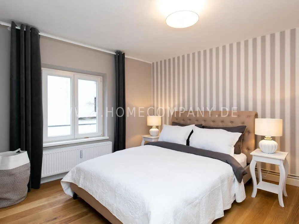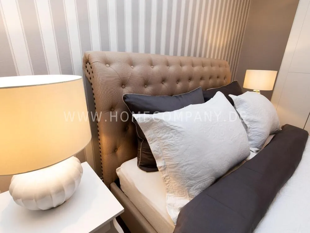 The open plan kitchen has a small, cozy dining area. The quiet living room facing the inner courtyard is a real oasis of well-being and optimal comfort in the north with one of a 1.60 wide elegant upholstered bed in elegant beige with a linen look. The almost 90 cm high headboard is comfortably upholstered, has a closed edge and is connected in addition to the classic quilting seams with button negotiations and a decorative ornament with metal rivets on the same edge. The apartment is close to the Dammtor train station as well as to the Hamburg trade fair and the popular Schanzenviertel and Grindelviertel.