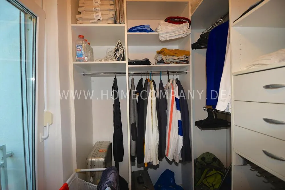 The bedroom has a king-size bed with a high-quality Tempur mattress, Joop furniture, a walk-in closet, a balcony, and garden access.