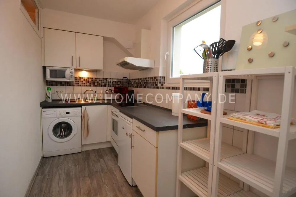 Fully equipped kitchen with washing machine, stove, oven and microwave. No dishwasher.
