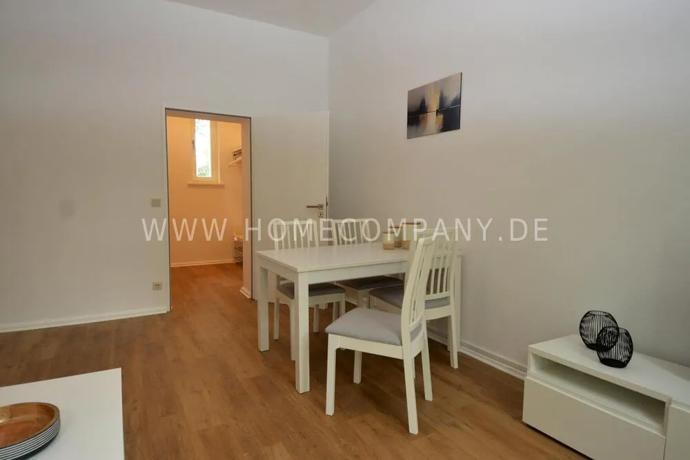 The apartment is fully furnished and offers 50 square meters of living space with a sofa area and a dining table with four chairs.