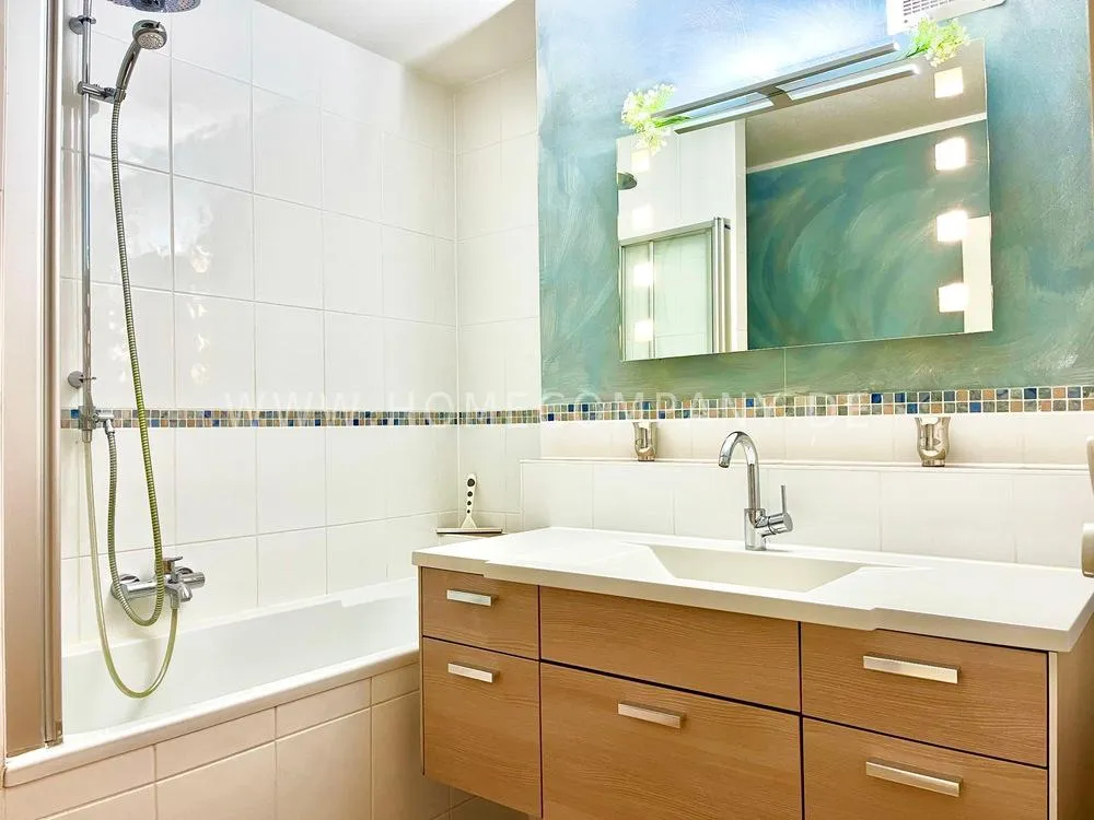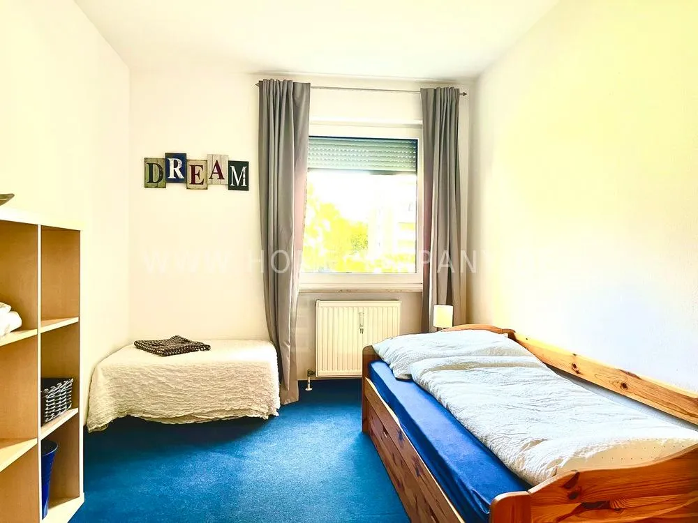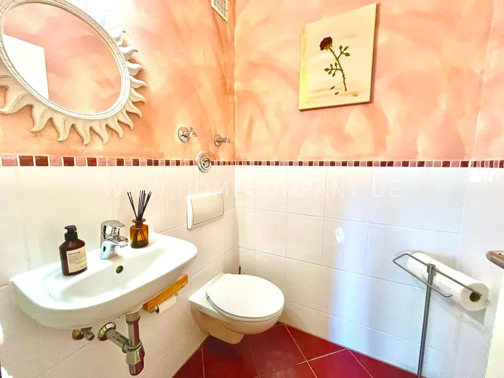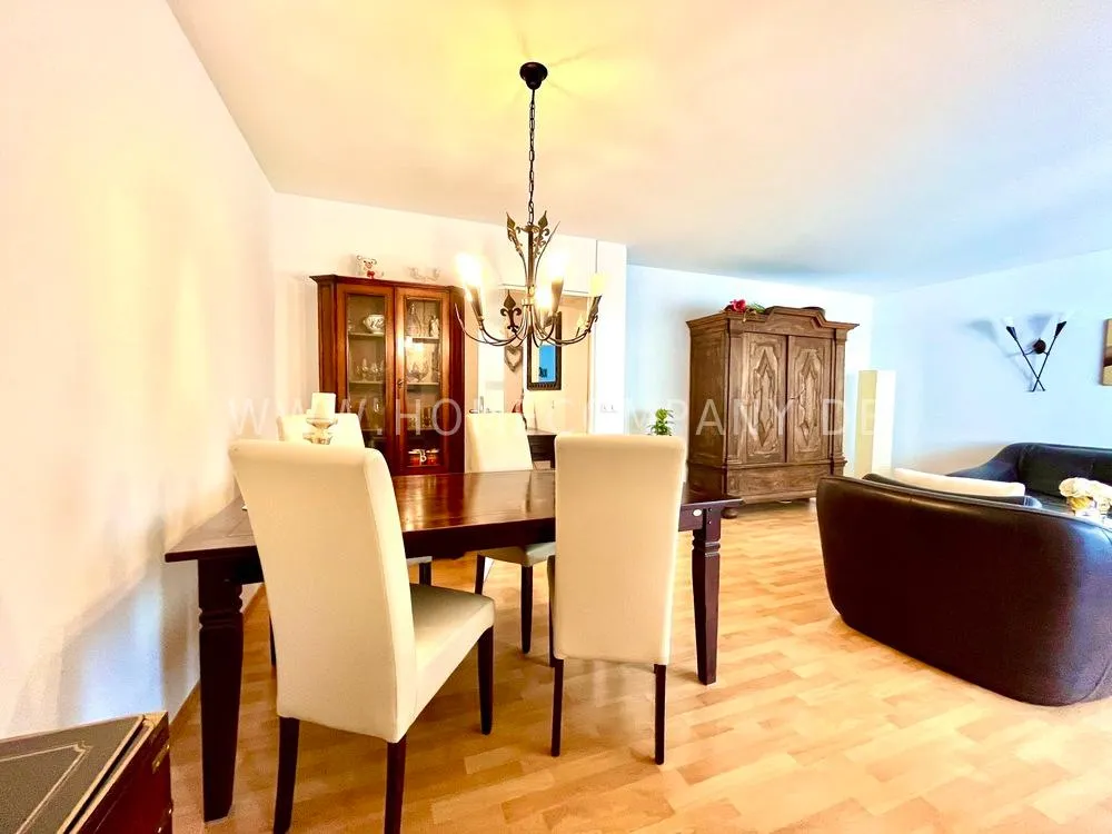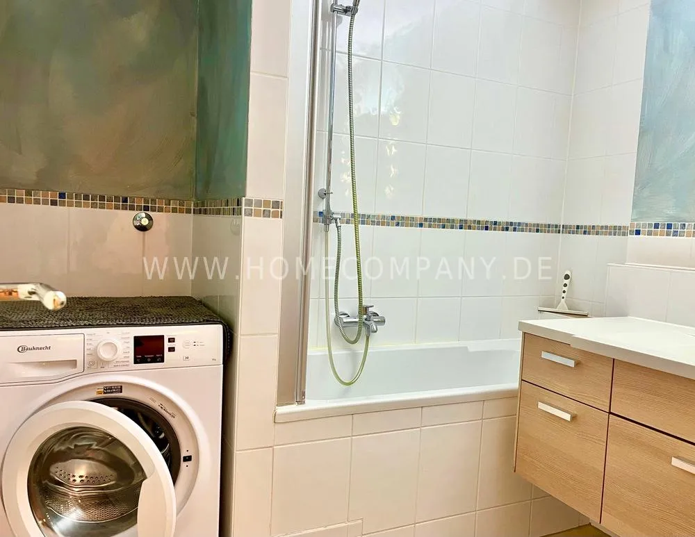 Very nice furnished 3-room flat with balcony (1st floor with lift) in Bogenhausen. Quietly located near Arabellapark. Sunny living room with spacious suit and balcony access. Bedroom with double bed and wardrobe with sliding doors. Extra sleeping facility in guestroom. Modern white fitted kitchen with dishwasher and cosy breakfast area. Bathroom with bathtub. Extra WC. Laminate flooring. Collective-use washing machine in the launderette of the house. Underground parking inklusiv. Various shops and public transport can be reached in a few minutes. Internet on request.