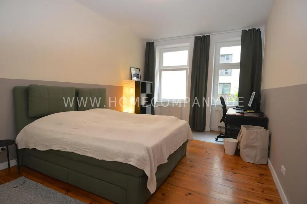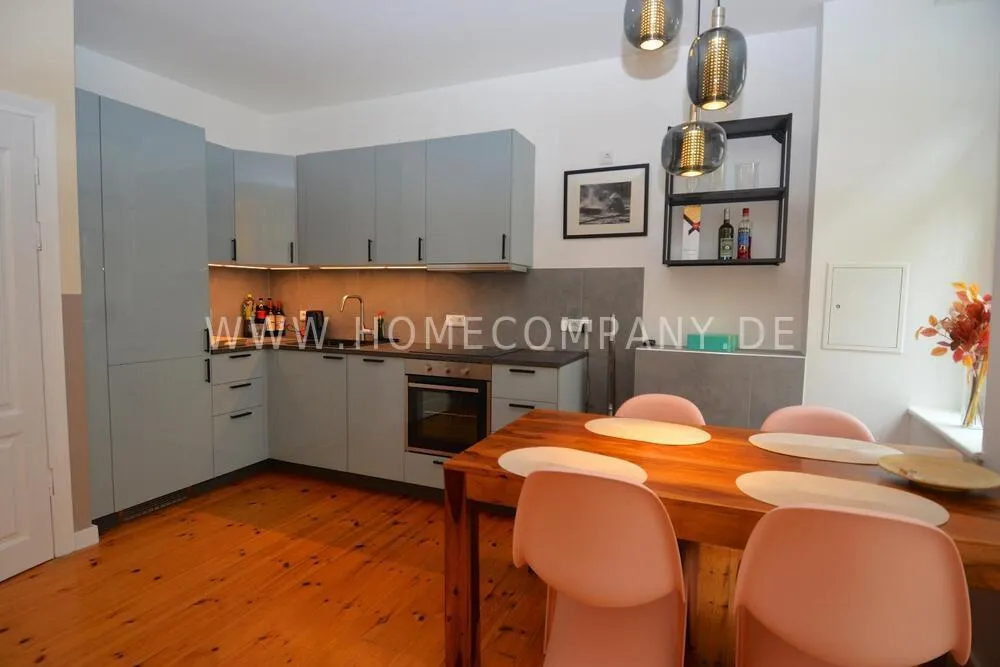 The apartment is fully furnished with a fitted kitchen, dining table with 4 chairs, sofa, kitchen, box spring bed, Pax wardrobe, washer-dryer, work table and chair, Kallax and Billy shelving.