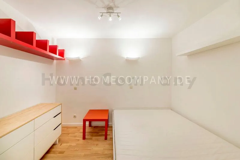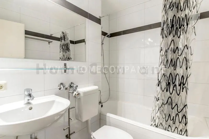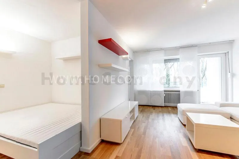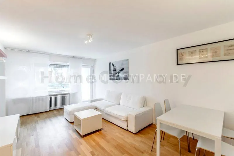 Very pretty furnished 1-5 room flat with balcony in Denning. Ground floor, very quiet overlooking the greenery. Beautiful bright living room with white sofa and dining/work table, with chairs for 4 people. Separate sleeping area with double bed (1.60 x 2m) and sideboards. The separate modern white fitted kitchen has a window and is equipped with everything you need daily (ceramic hob, oven, fridge/freezer combination, cooker etc.). The new bathroom has a bathtub. A spacious storeroom in the entrance area serves as walk-in closet and offers ample storage.