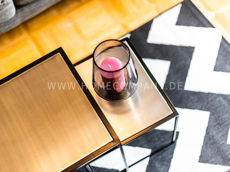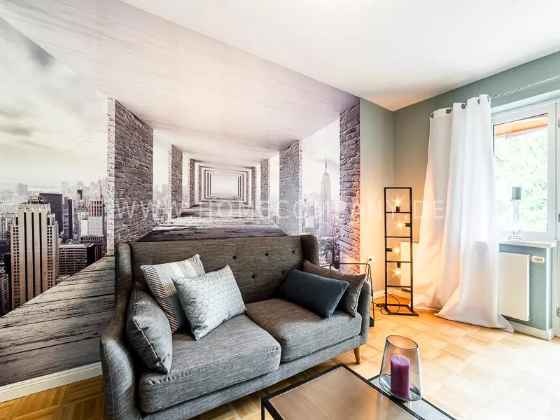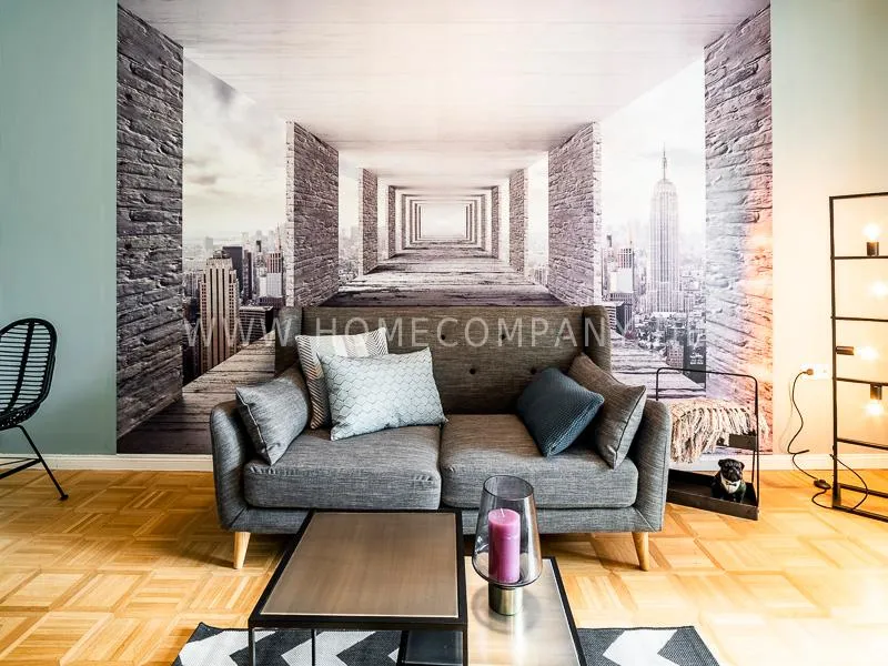 The wall design in grey-blue tones and grey, black-and-white and wood tones in the selection of furniture create an atmosphere in which the living room furniture give the impression that they rather discreetly step back to give the unique wallpaper its grand entrance left. Precious walnut and walnut wood and purpose-built vintage chic elements are cleverly combined with brass and zinc-colored and polished copper and chrome accessories